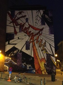 I like the Belgians. Swathes of their capital have been utilised as canvases for street art, and yet nobody seems to mind. The most spectacular examples we saw were on an otherwise unremarkable street called Bogaardenstraat, which is about a 15 minute walk from Brussels Midi station. We looked across the road and wham! A building-sized painting of a man brandishing a gun above his head was looming over us. It made about as much sense to us as Hieronymous Bosch’s Portcullis Arse, but not to worry, because on the very same street there’s also a gigantic cartoon of a man waiting for a tram. Belgian street art: catering for all tastes.