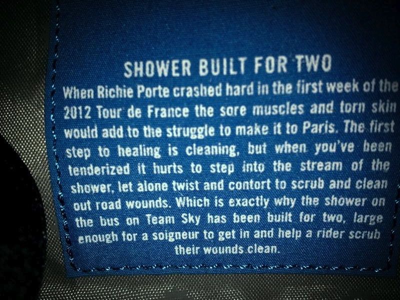 The fashionable literary genre of S&M appears to have infiltrated one of the mini-stories that Rapha famously sews into its garments. New Sky signing Ian Boswell spotted the intriguing tale of a soigneur climbing into a shower to get his hands on bruised and battered Richie Porte – but how does the steamy story end? James Fairbank, Rapha’s head of marketing, suggests you will need to buy all 11 variations of the new Sky jerseys to find out. Just in case he isn’t joking, here’s a suggestion for a title: 50 Shades Of Gains (Marginal).