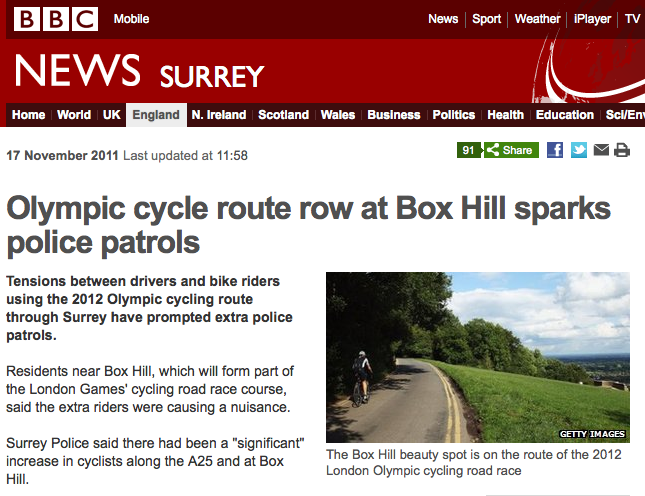 Olympic cycle route row at Box Hill sparks police patrols”. Police patrols? Are mild-mannered cyclists, emboldened by the global mood of fed-upness manifested by makeshift campsites at Wall Street and St Paul’s, now protesting about their own crisis on Mole Valley’s famed Zig-Zag? No. No, they are not. Read on, and it becomes clear that the story is actually about police telling cyclists – ordinary cyclists like, perhaps, yourself – to observe the rules of the road because they’ve had complaints from local residents. In the context of the story, there is no “row” about the Olympics. There is a suggestion that the tensions have been triggered by more cyclists coming to try out Box Hill because it is part of the Olympic route, but the police sergeant quoted seems to think otherwise: “This isn’t an issue solely of cyclists but an issue of increased visitors to Box Hill full stop.” So despite the headline and the angle of the story, The Olympics has bugger-all to do with anything.