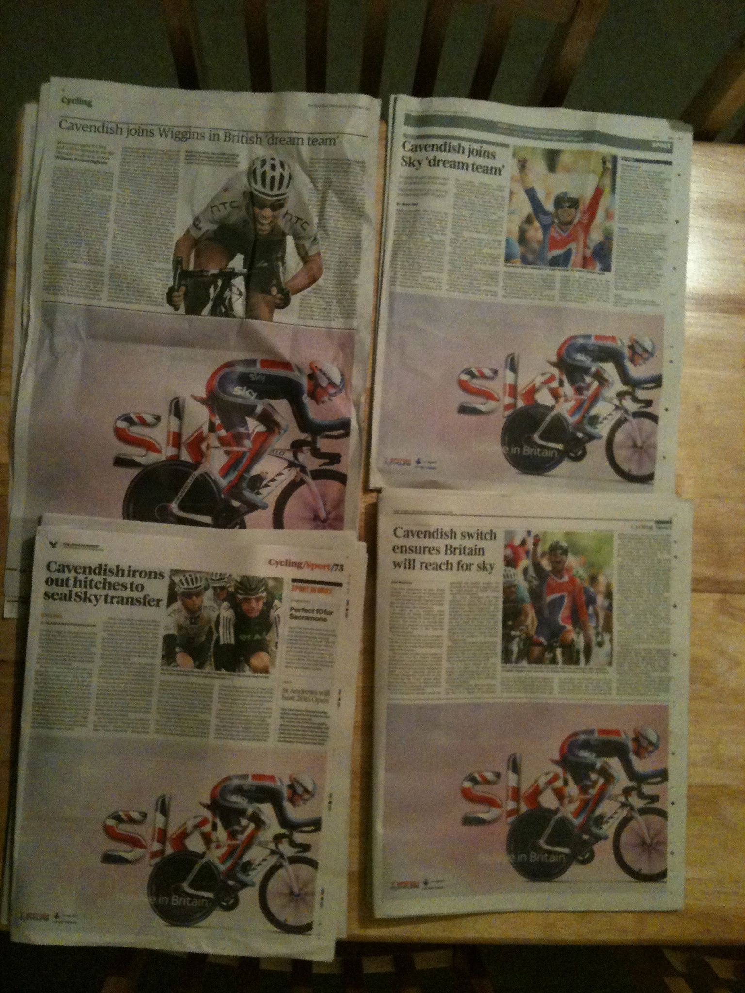 You could say that the prominence each paper gave to the story reflects its readership’s interest in cycling. But look at the Daily Mail – next to the paper’s brief, 80-word story on page 76 is a ragout of its June exclusive, “GB DREAM TEAM, Cavendish in shock move to join Wiggins.”